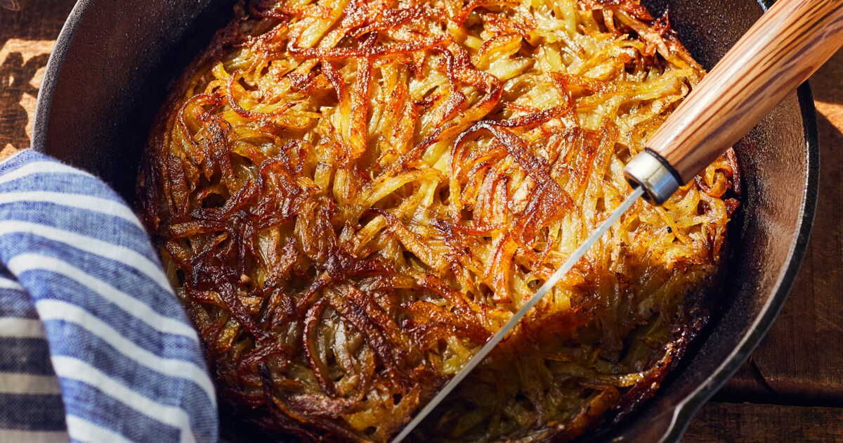 - Dans une poêle huilée, déposez la moitié des pommes de terre, pressez bien les bords. Recouvrez avec le reste des pommes de terre et faites cuire à feu doux 40 minutes de chaque côté pour obtenir une texture croustillante.