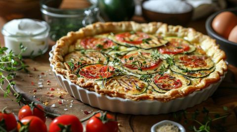 3. Montage et cuisson : Préchauffez le four à 180°C. Étalez la pâte brisée dans un moule à tarte graissé, piquez le fond, puis déposez-y les légumes. Versez l'appareil à tofu par-dessus et ajoutez les tomates cerises coupées en deux. Saupoudrez d'herbes de Provence et enfournez pendant environ 35 minutes, jusqu'à ce que la quiche soit bien dorée.