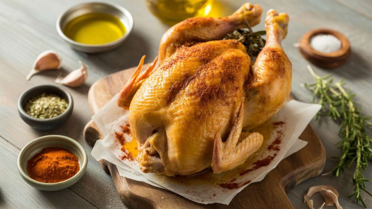 Dans un récipient, combinez l'huile d'olive, le paprika, l'ail en poudre, les herbes de Provence, le sel et le poivre. Appliquez ce mélange sur toute la surface du poulet.