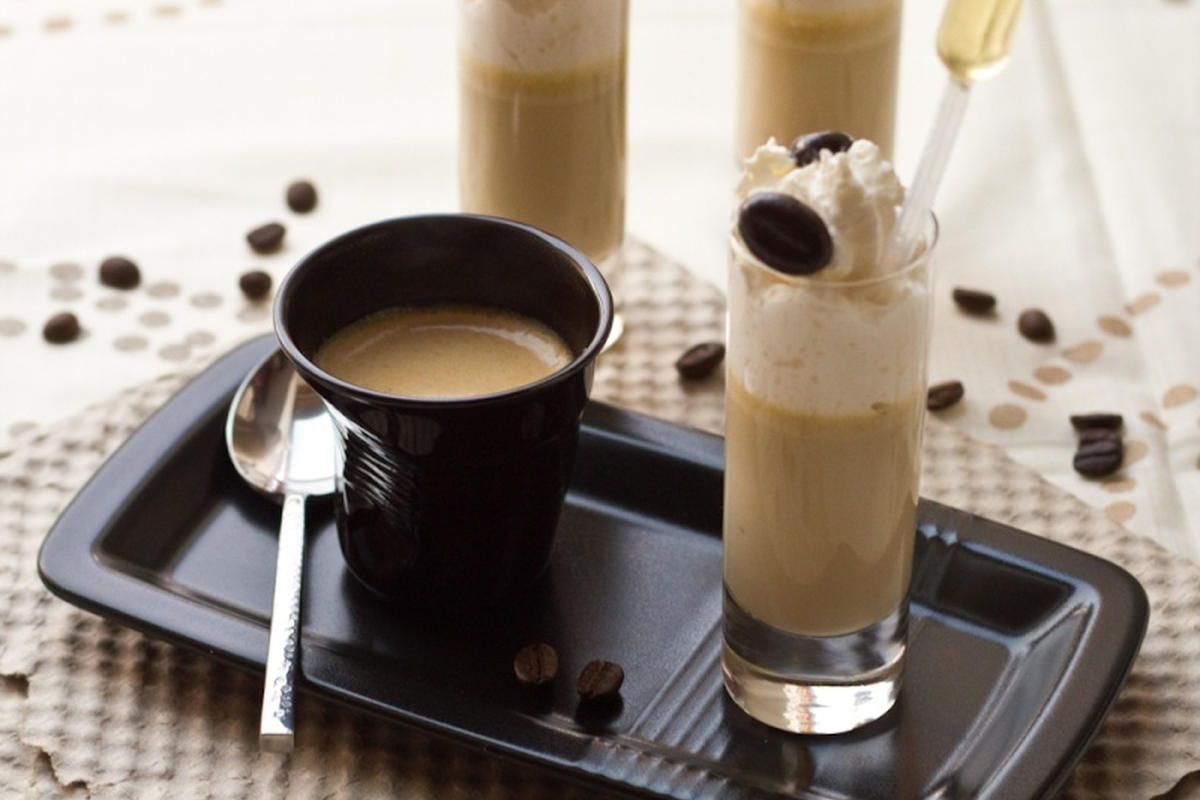 - Pour la décoration, ajoutez la chantilly sur chaque crème au café, insérez une pipette de whisky et terminez avec des grains de café au chocolat. Servez immédiatement!