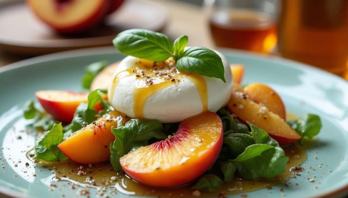 Servez immédiatement pour apprécier pleinement la texture crémeuse de la burrata et la fraîcheur des pêches.