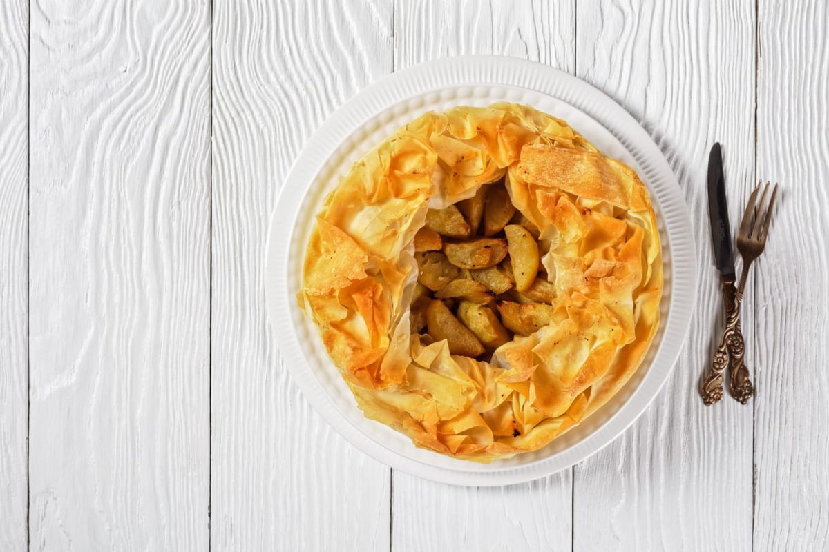 - Sur un plan de travail, déposez une feuille de pâte filo, badigeonnez-la de beurre fondu puis ajoutez une seconde feuille. Répétez l'opération avec les autres feuilles. Au centre, disposez les dés de pommes cuits et ajoutez des tranches de boudin.