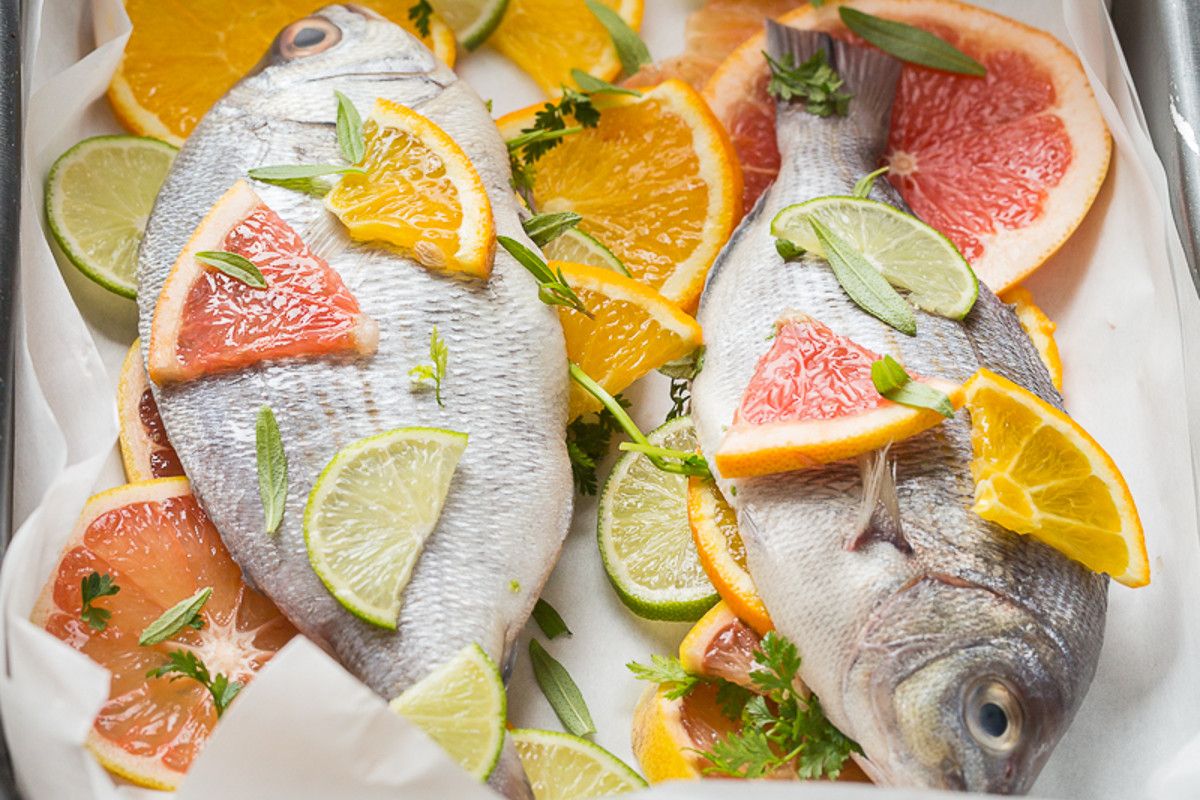 - Placez les daurades sur les agrumes, insérez quelques brins de coriandre à l'intérieur de chaque poisson. Ajoutez le reste des rondelles d'agrumes, assaisonnez avec du sel et du poivre, puis arrosez d'huile d'olive et de jus d'orange.