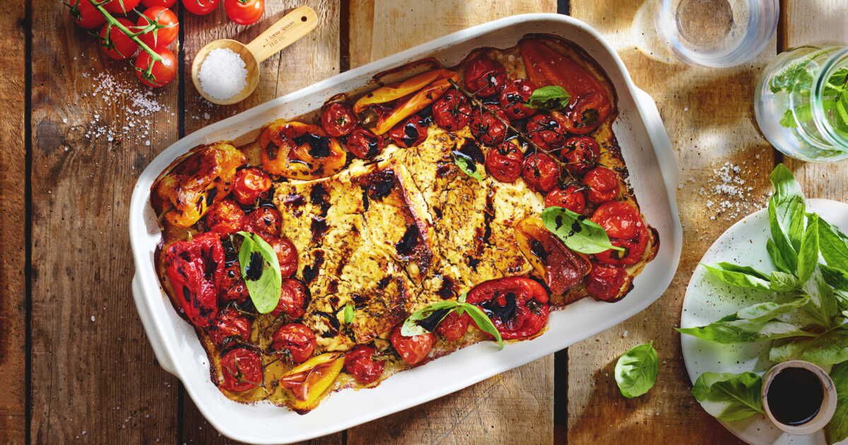 - Dans un plat à gratin, déposez la féta entourée de tomates et de poivrons, puis arrosez d’huile d’olive.
