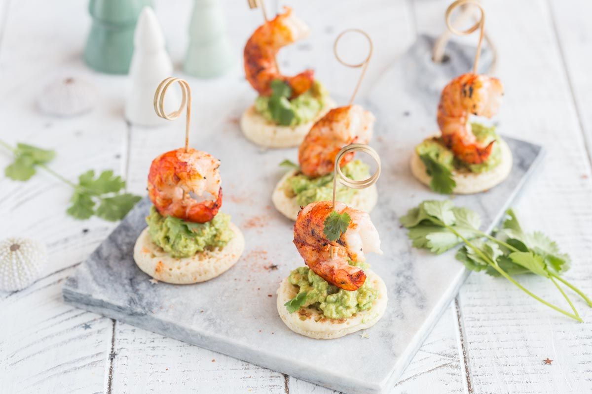 Blinis au guacamole et crevettes grillées