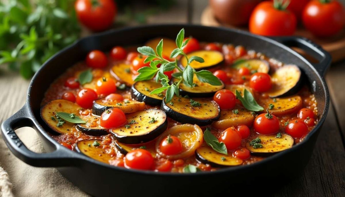 Servez votre ratatouille chaude dans un bol rustique ou une grande assiette creuse. Pour la touche finale, décorez d'une brindille de thym frais juste avant de présenter ce délice culinaire à vos convives.