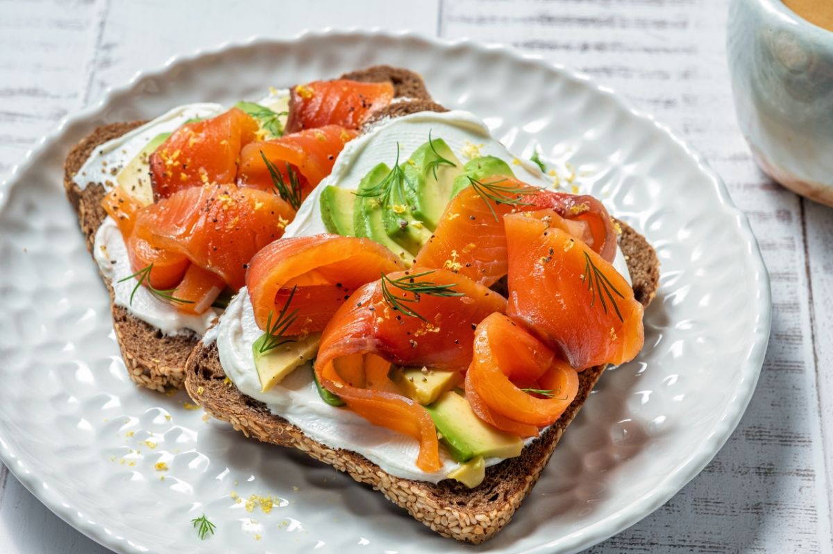 - Tartines avocat-saumon : Pour une option savoureuse, optez pour des tartines à base de pain riche en fibres, comme du pain viking ou noir. 100 g de saumon fumé contiennent environ 22 g de protéines, et un avocat apporte de 3 à 4 g.