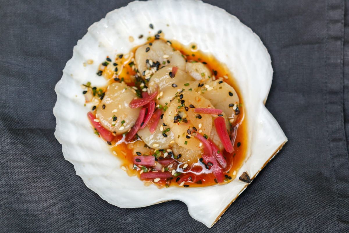 - Nappez les saint-jacques de vinaigrette et de sauce miso, puis caramélisez-les à l'aide d'un chalumeau. Parsemez de sésame grillé et râpez un peu de citron vert dessus.