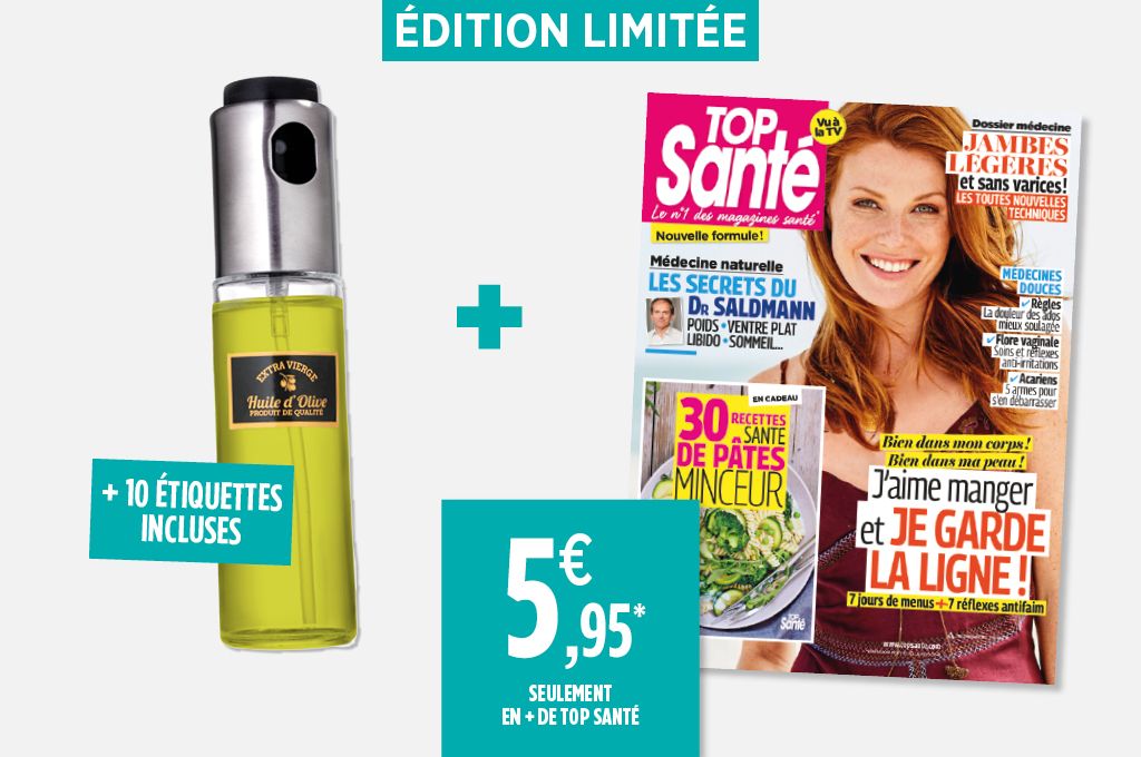 * Offre magazine (2,90 €) + spray à huile (5,95 €) = 8,85 €. Valable du 31/03/2017 au 28/04/2017, dans la limite des stocks. Top Santé, seul, à 2,90 €. Spray à huile, seul, à 15 €, demande limitée à un par foyer.